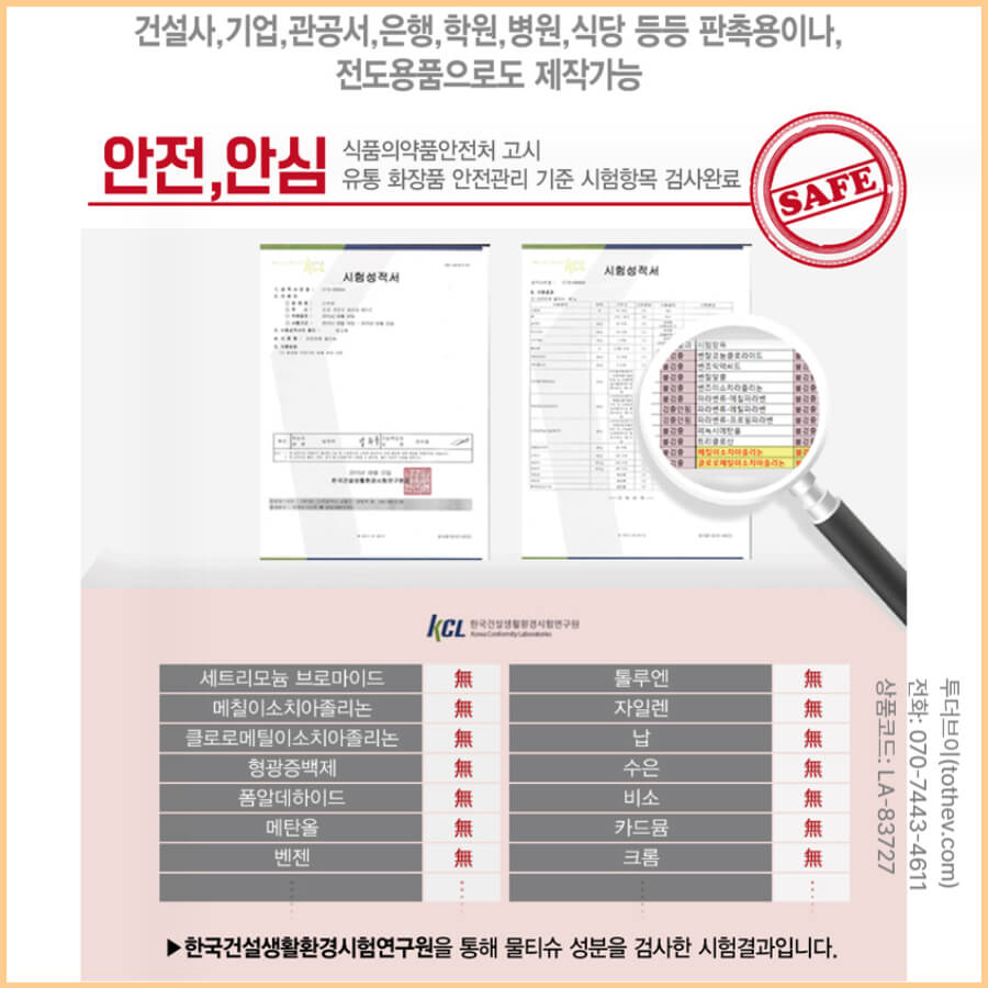 한국건설생활환경시험연구원(KCL) 인증을 통해 안전성과 품질을 검증받았습니다. 기업 홍보물이나 고객 증정용으로도 신뢰도를 높일 수 있는 제품입니다.