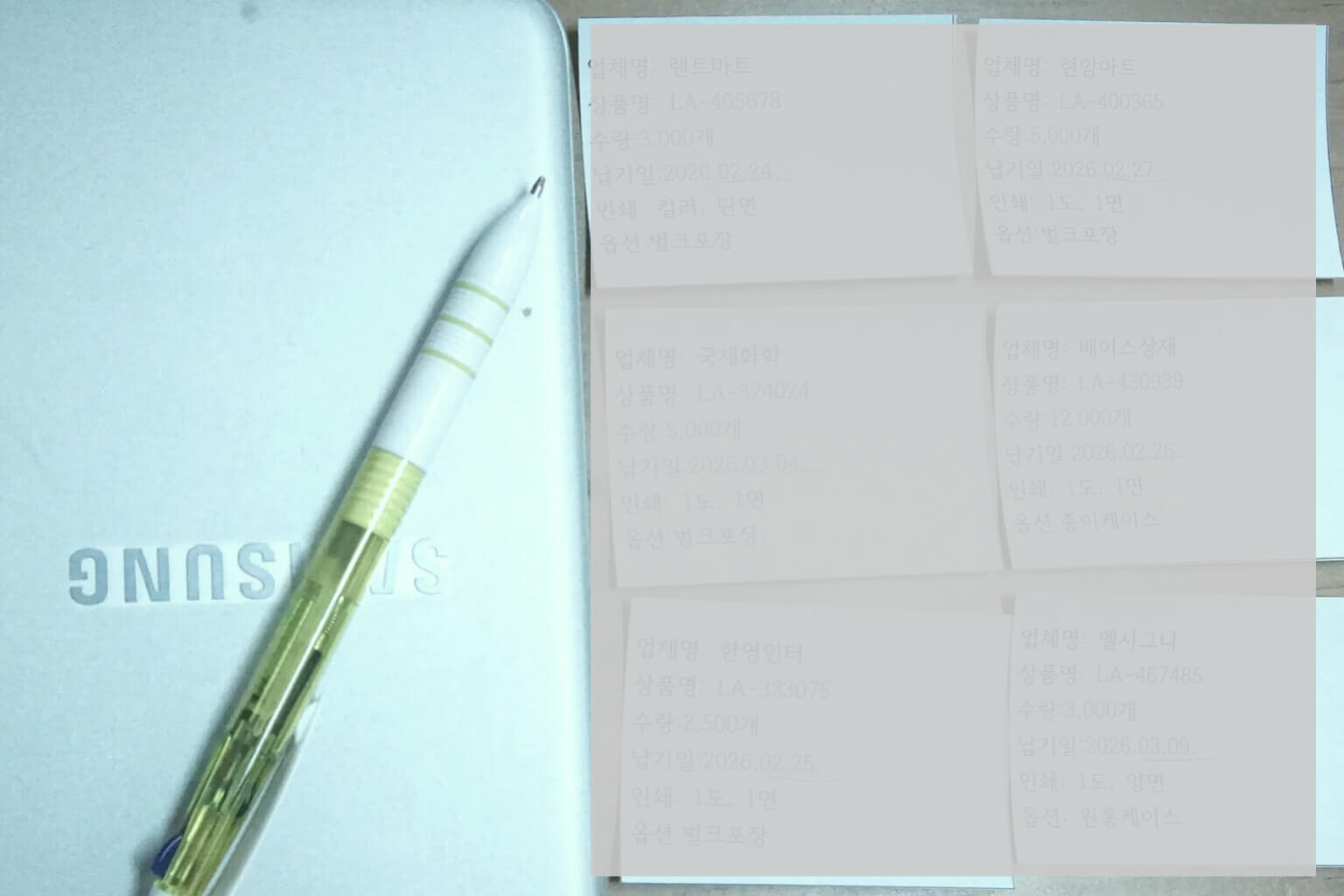 수량 납기 인쇄 옵션이 적힌 주문 메모 예시