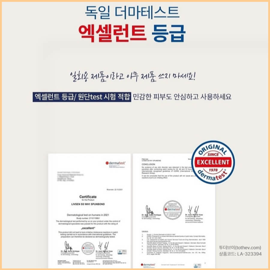 “일회용 제품이라고 아무 제품이나 쓰지 마세요.” 투더브이 일회용앞치마는 엄격한 기준으로 유명한 독일 피부과학연구소 더마테스트의 인체 피부 적용 시험에서 저자극 테스트 안정성 최고 등급인 EXCELLENT를 획득했습니다.
