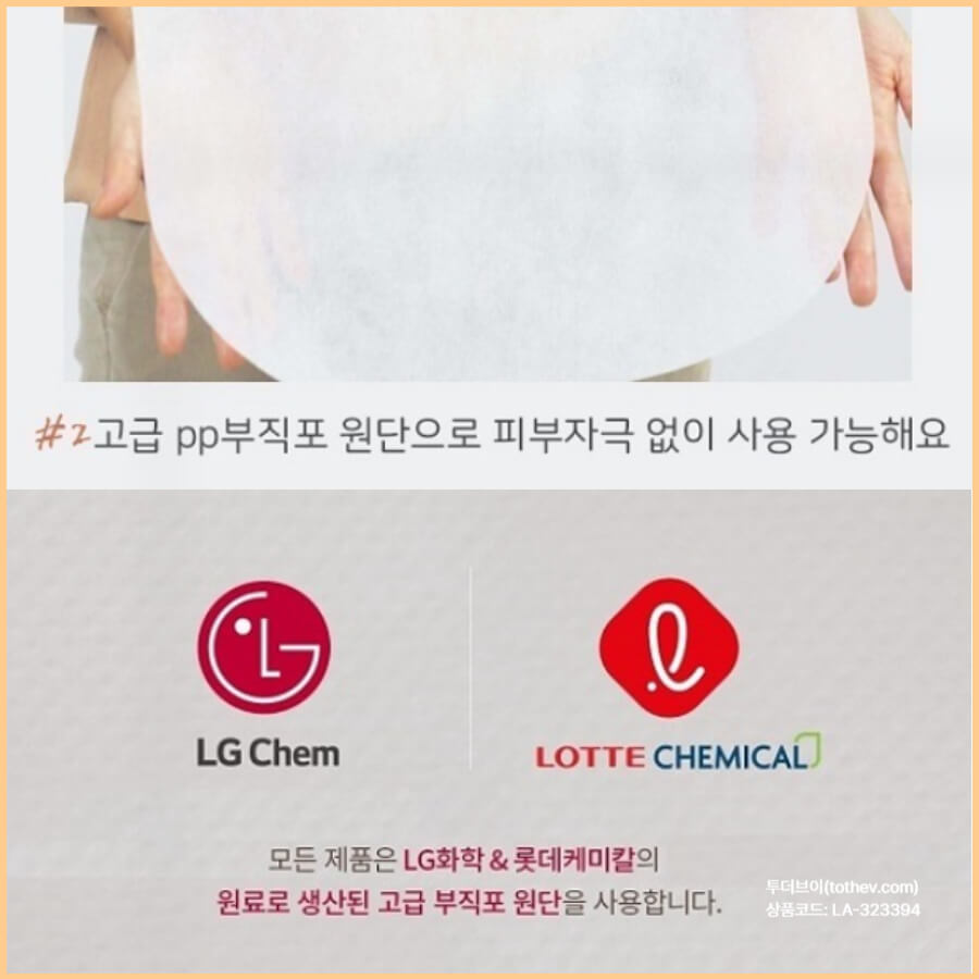 투더브이 일회용앞치마는 LG화학과 롯데케미칼의 원료로 생산된 고급 pp부직포 원단만을 사용합니다. 피부에 직접 닿는 제품인 만큼, 저가 중국산 원단이 아닌 믿을 수 있는 국내 원료로 제작해 퀄리티 차이가 확실합니다.