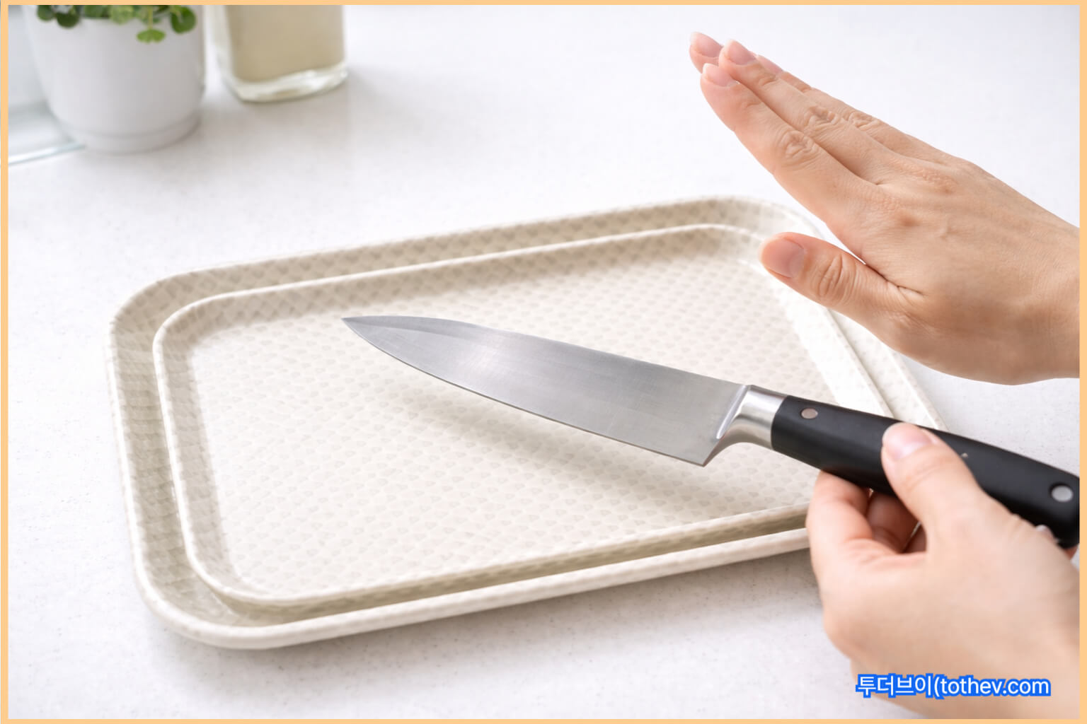 안내문에는 “절단 작업은 도마 사용, 쟁반은 서빙/정리 용도”로 역할을 분리해 적는 것이 가장 안전합니다.