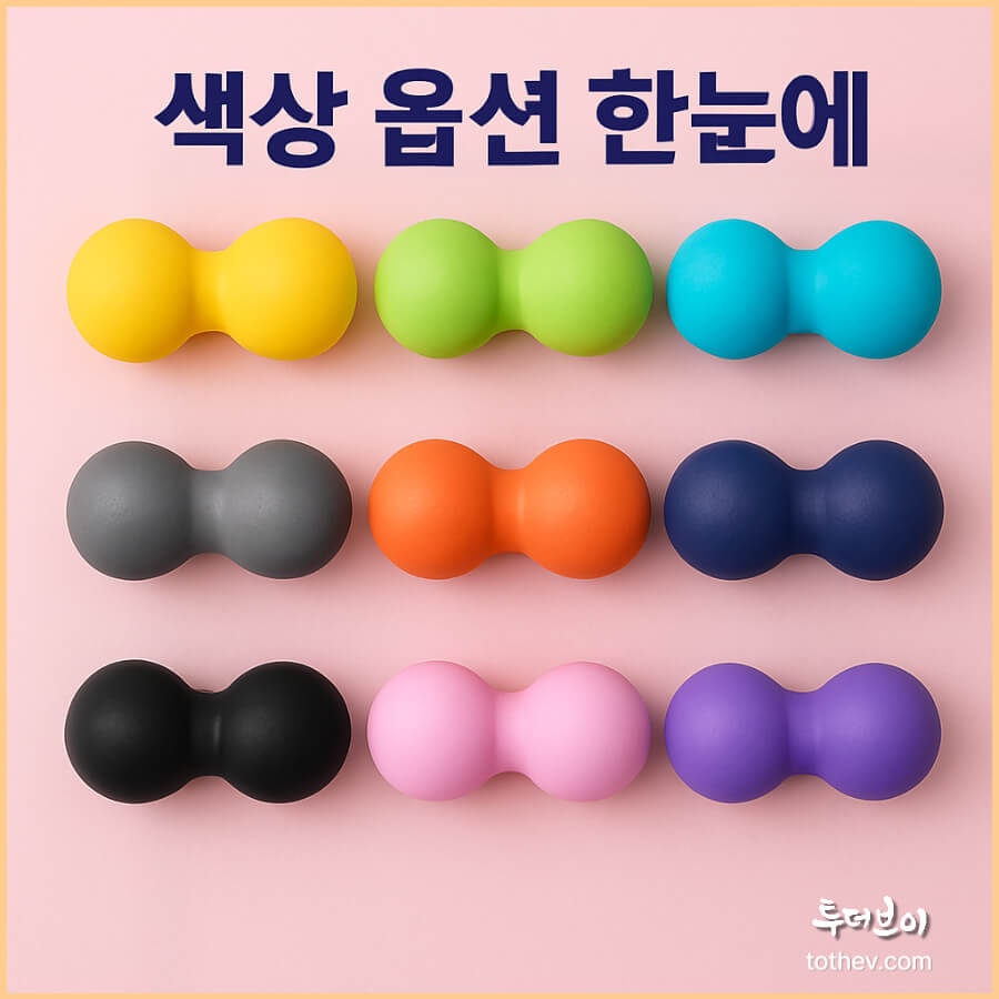 대부분의 땅콩마사지볼은 EVA, TPR, PU 등 탄성과 복원력이 좋은 소재를 사용합니다. 너무 딱딱하지 않으면서도 눌렀을 때 적당한 압이 들어가고, 사용 후에는 원래 형태로 돌아오는 것이 특징입니다.