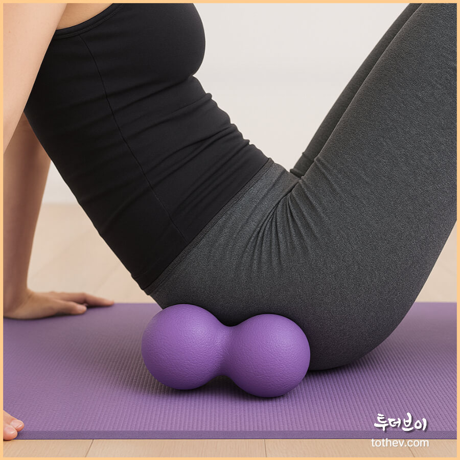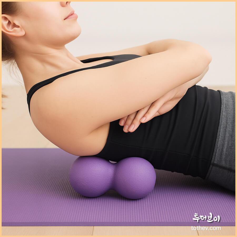 장시간 앉아서 작업하는 직장인에게 가장 추천하는 사용법입니다. 요가매트 위에 누워 견갑골 아래에 땅콩마사지볼을 위치시키고, 팔을 가슴 앞에서 교차한 뒤 천천히 위·아래로 롤링하면 어깨와 등 근막이 부드럽게 풀립니다.