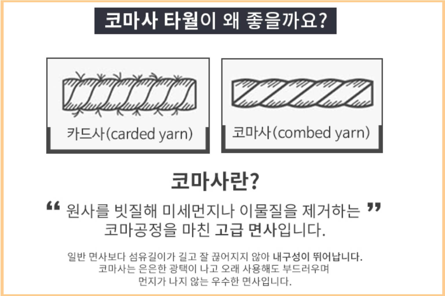 코마사는 원사를 빗질해 미세먼지·이물질을 제거하는 공정을 거친 면사로, 일반 면사 대비 보풀이 적고 사용감이 부드러운 편입니다. 170g수건을 답례품/단체 납품용으로 선택할 때, 코마사 면 100%는 “관리 편의성”과 “클린한 첫 사용 경험” 측면에서 장점으로 작동합니다.
