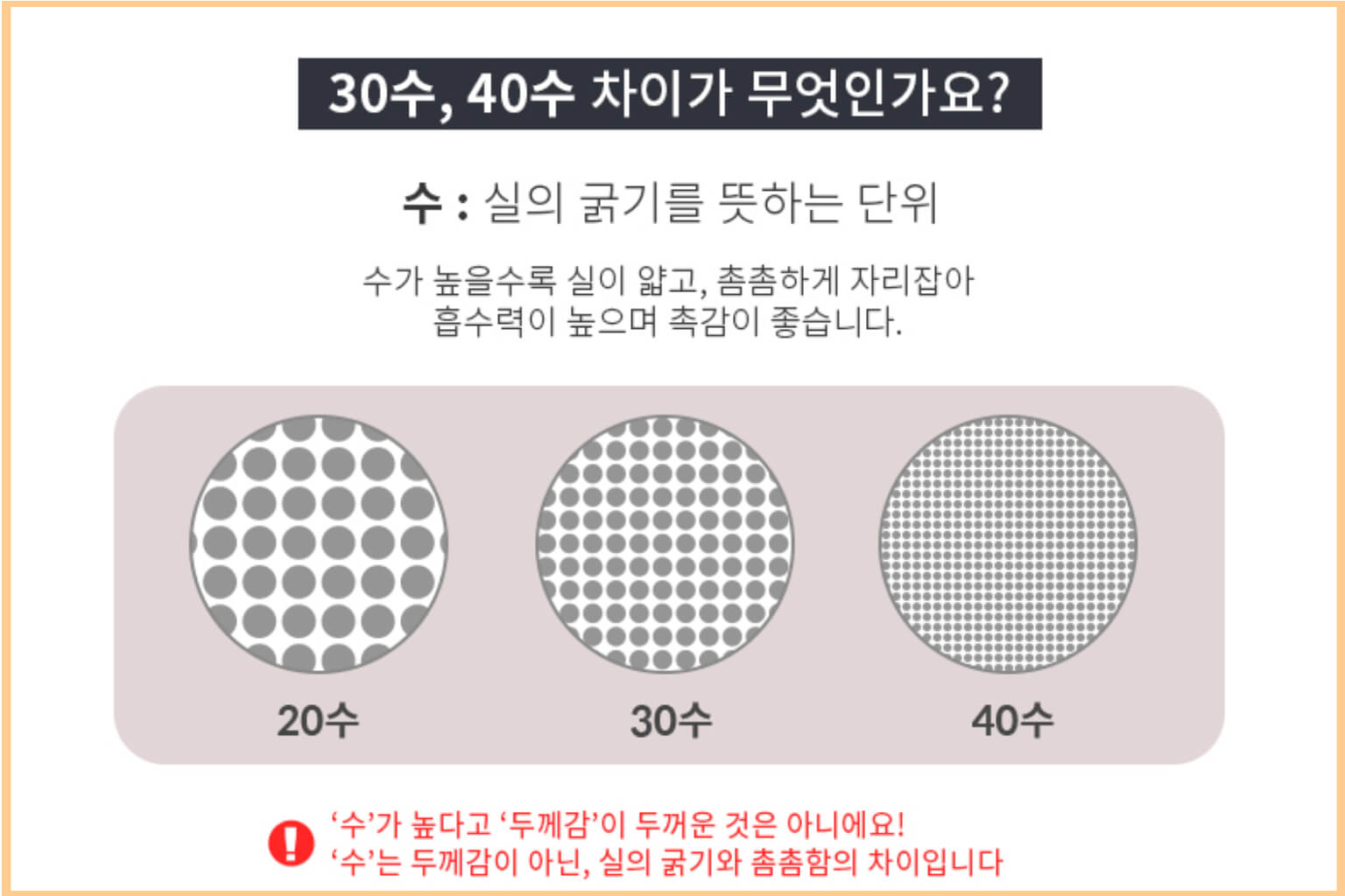 4) 30수 vs 40수: 두께가 아니라 ‘실 굵기’ 이야기