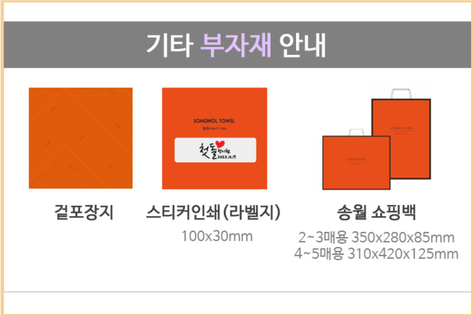 1P·2P 박스 규격이 정리되어 있으면, 예산과 전달 방식(현장 배포/택배 발송)에 맞춰 선택이 쉬워집니다. 또한 겉포장지·스티커(라벨지)·쇼핑백 같은 부자재는 답례품의 완성도를 결정하는 요소라, 수건 자체가 170g수건처럼 도톰할수록 패키징과의 시너지가 큽니다.