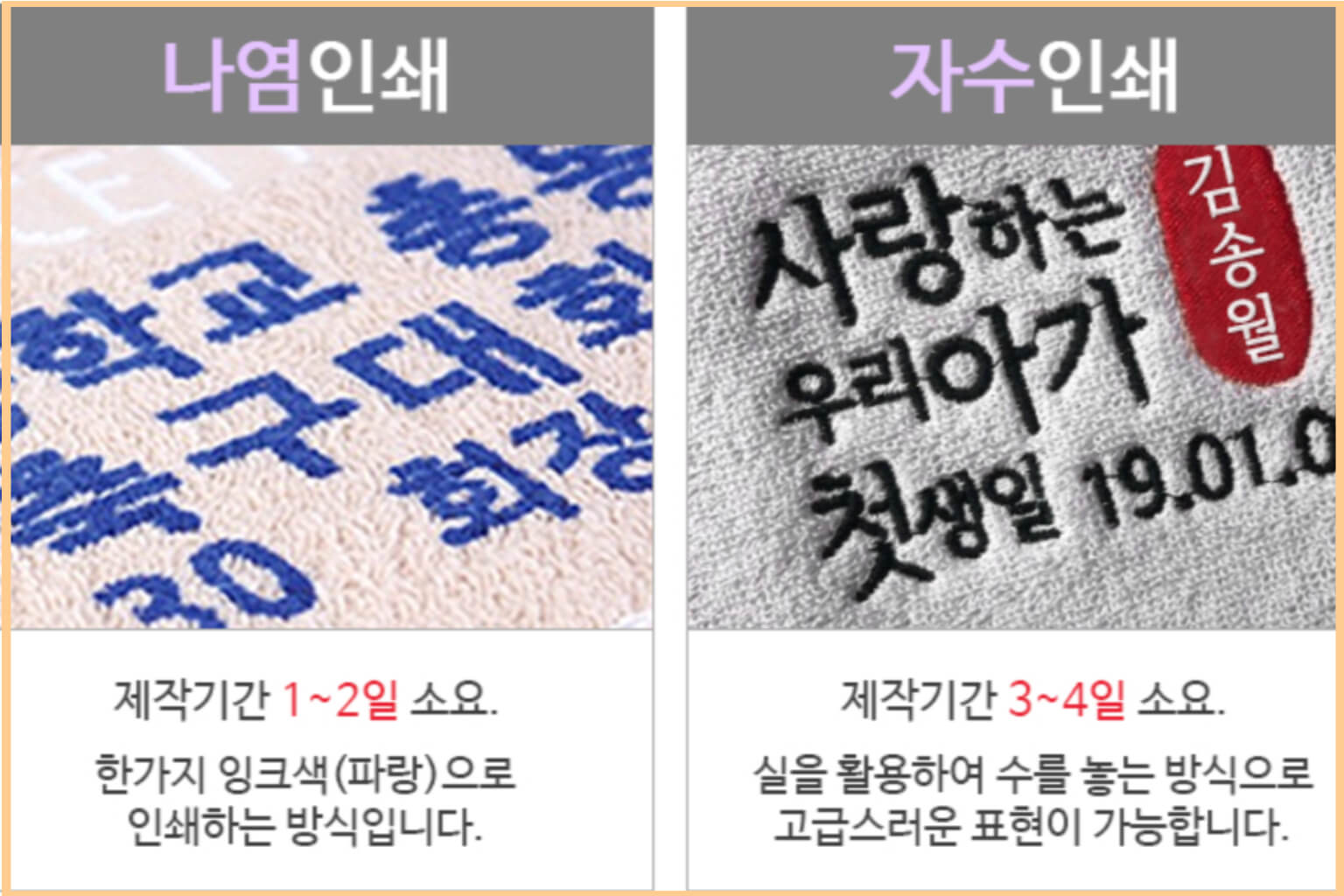 단체제작에서는 인쇄 방식에 따라 납기가 달라집니다. 빠른 납기가 필요하면 나염인쇄(약 1~2일), 고급스러운 표현과 내구성을 중시하면 자수인쇄(약 3~4일)가 일반적인 선택지입니다. 행사 일정이 촉박할수록 170g수건 수량 확정 → 인쇄 방식 확정 → 포장 확정 순으로 빠르게 잠그는 것이 안전합니다.