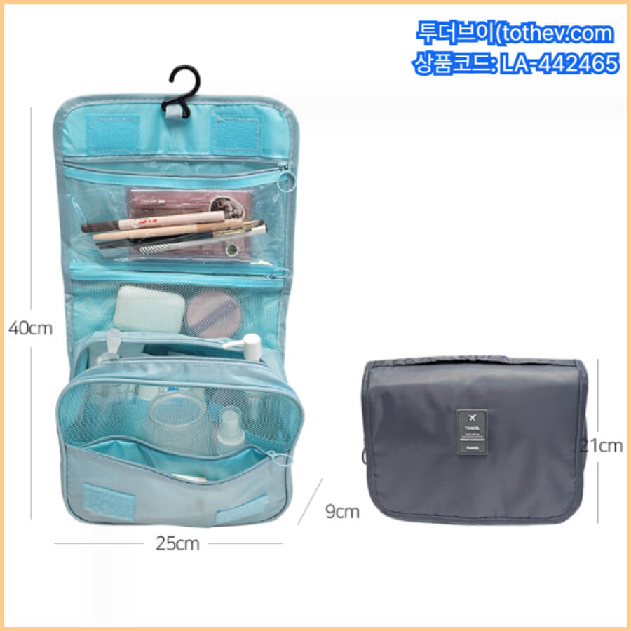 여행용세면파우치 상단에는 후크 걸이가 있어 호텔 욕실 수건걸이나 문고리에 그대로 걸어 사용할 수 있습니다. 세면대 공간이 좁아도 파우치를 펼치기만 하면 모든 세면도구를 한눈에 볼 수 있어 여행용세면파우치판촉물로 받은 고객들의 만족도가 높습니다.