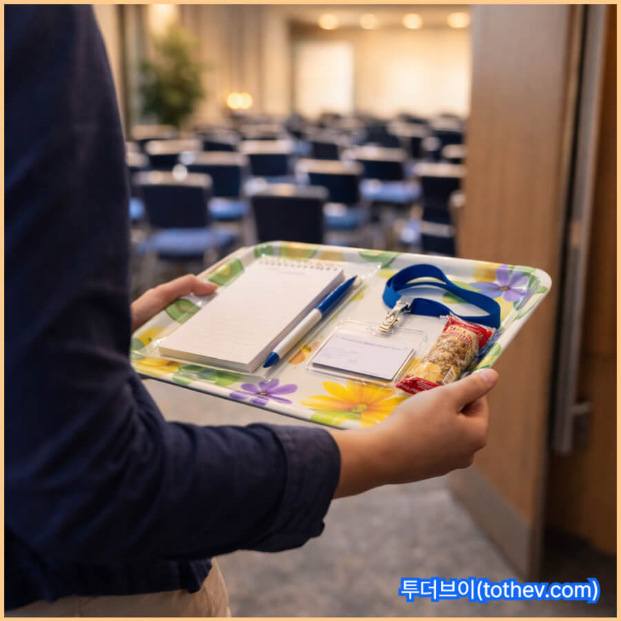 워크북·포스트잇·명찰·간식처럼 구성품이 늘어나는 경우 트레이가 더 빛납니다. 책상 위가 어수선해지지 않게 “정리된 시작 경험”을 만들 수 있습니다. 운영팀이 현장 정돈에 쓰는 시간을 줄여줍니다.