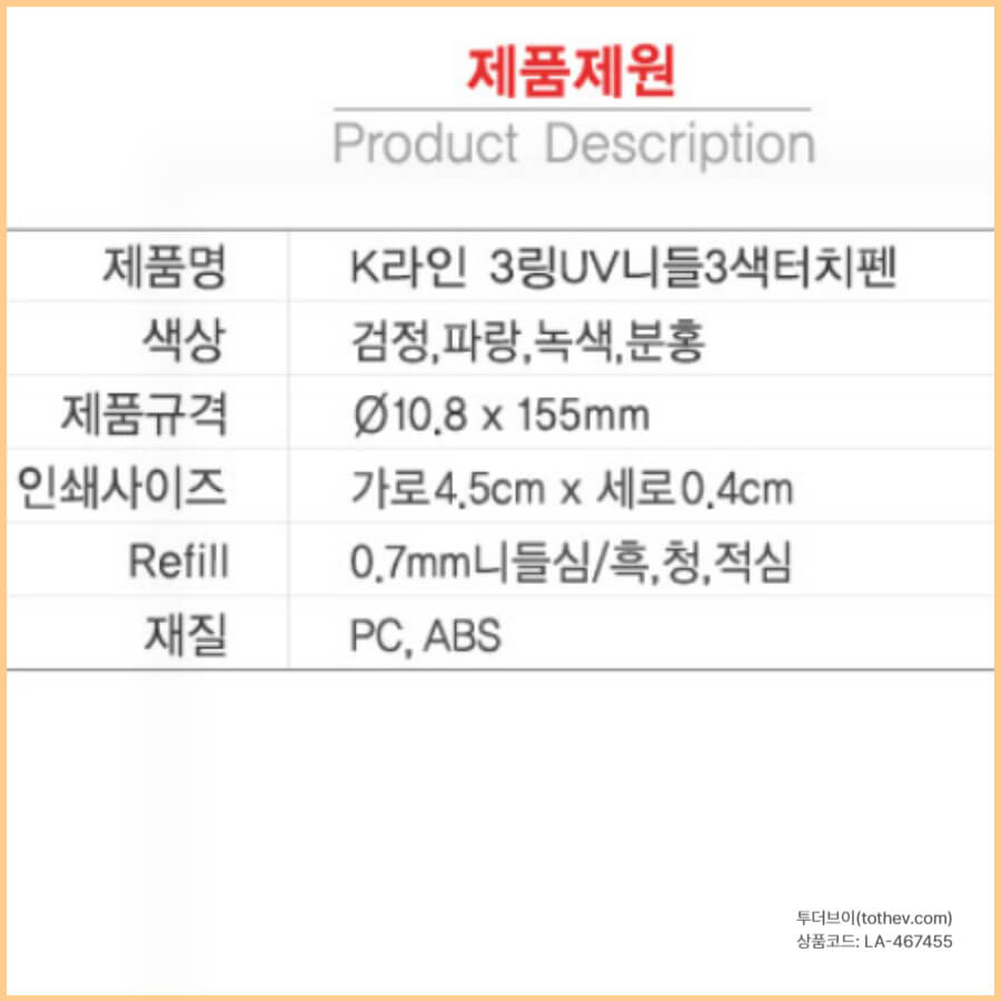 스펙만 보아도 일반적인 저가 볼펜 대신 퀄리티 있는 3색볼펜판촉물을 고민하시는 분들께 딱 맞는 제품이라는 걸 확인할 수 있습니다.