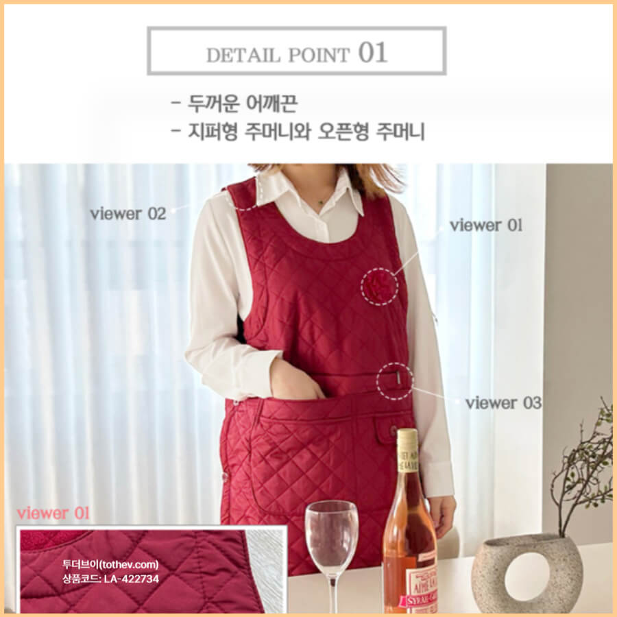 이 앞치마는 기모 원단으로 보온성이 뛰어나며, 겨울철 실내외에서 장시간 활동하는 환경에 매우 적합합니다. 특히 서빙·카페·홀업무처럼 움직임이 많은 업종에서 좋은 평가를 받고 있습니다.