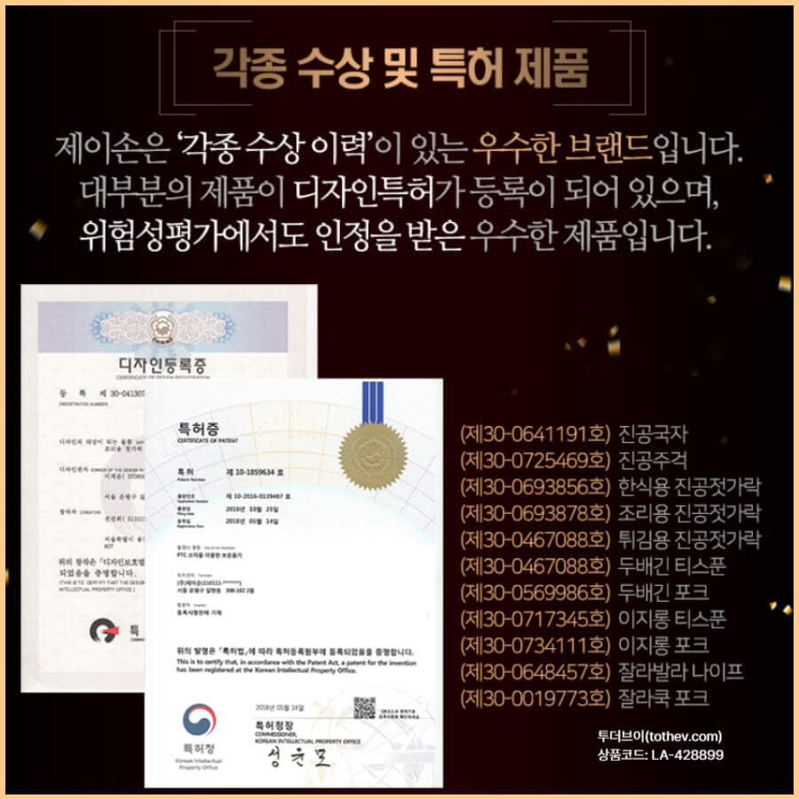 제이손 제품은 다수의 디자인특허와 인증서를 보유하고 있으며 위험성 평가에서도 인정받은 우수 브랜드입니다.