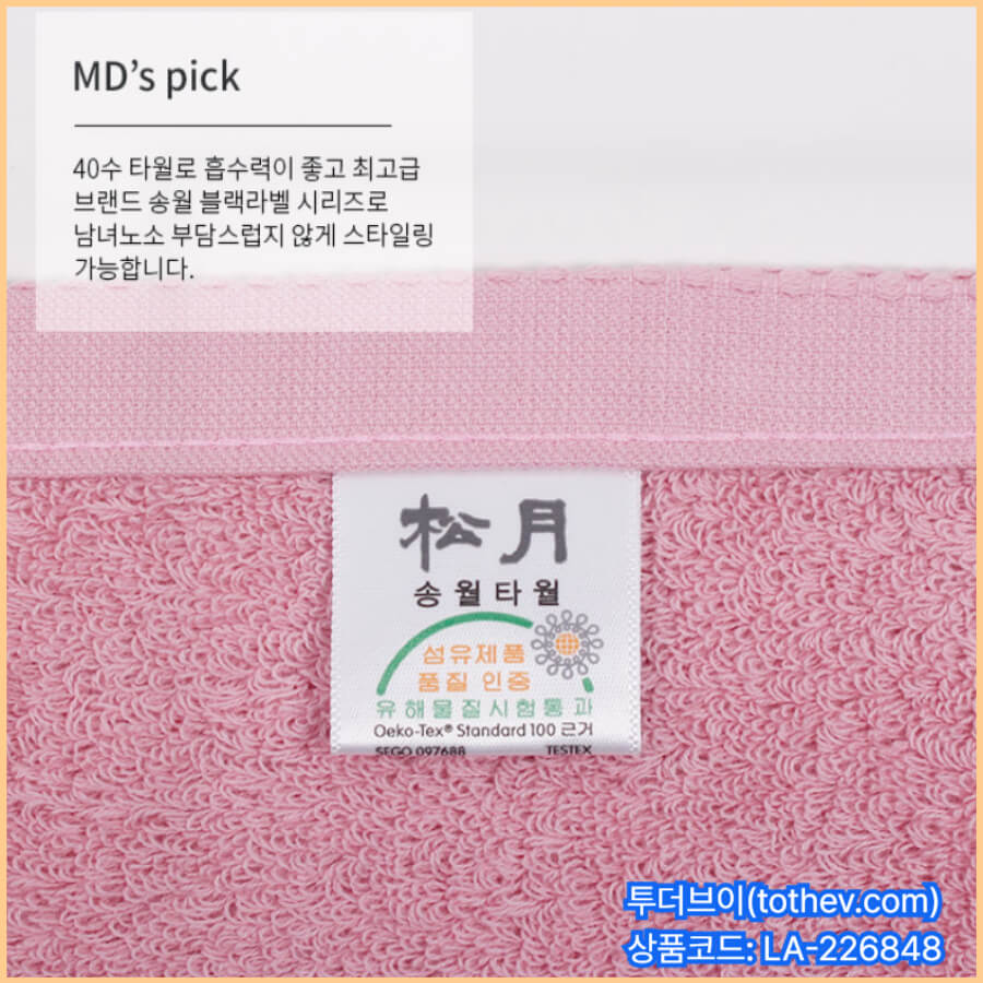 원단 클로즈업에서 파일이 고르고 촘촘하게 서 있으면, 물기를 빠르게 잡아주고 촉감이 정돈된 느낌을 줍니다. 송월 블랙라벨 40수 170g은 “호텔 타월”을 찾는 수요와도 결이 맞습니다.